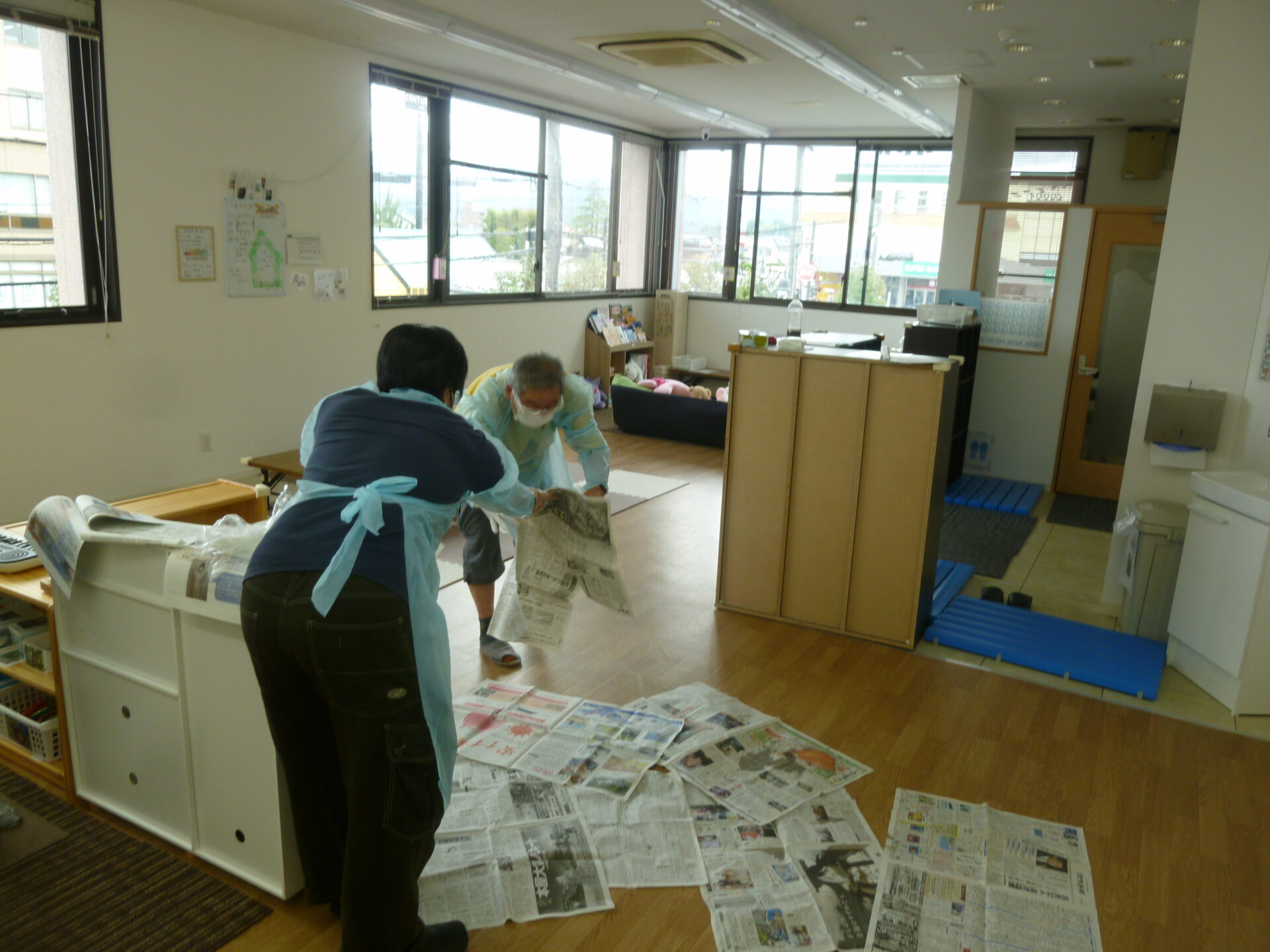 当事業所では、日々の支援の質を高めるために定期的に職員研修を行っています。今回は、「感染性胃腸炎を想定した嘔吐物の処理手順」について、実技を交えながら学びました。講師は、当職員で准看護師の池上先生にお願いしました。実際に防護具(手袋・マスク・エプロンなど)を装着し、適切な処理手順や消毒の方法を確認し、学びました。子どもが安心して過ごせる環境を守るため、今後も継続して感染対策の強化に取り組んでまいります。