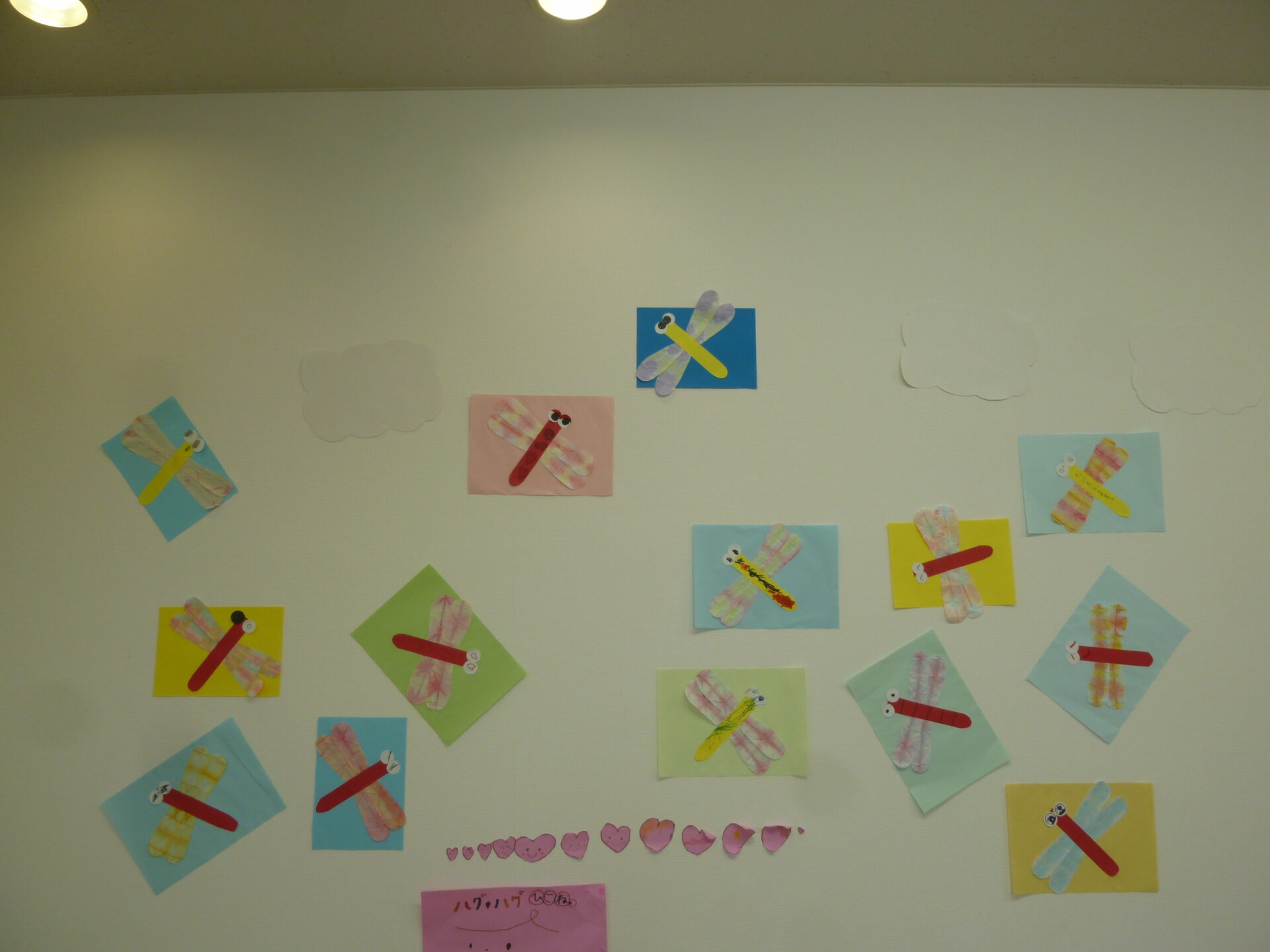 9月の壁面はみんなが制作した”トンボ”でした✨トンボの羽は、絞り染めで模様をつけました。コップの水に絵の具を溶かし、いろんな色を混ぜ羽に色付けしました🌈みんなの色付けの仕方が違い、模様も様々で綺麗な羽を付けたトンボ達が優雅にハグハグを飛んでいました😊✨